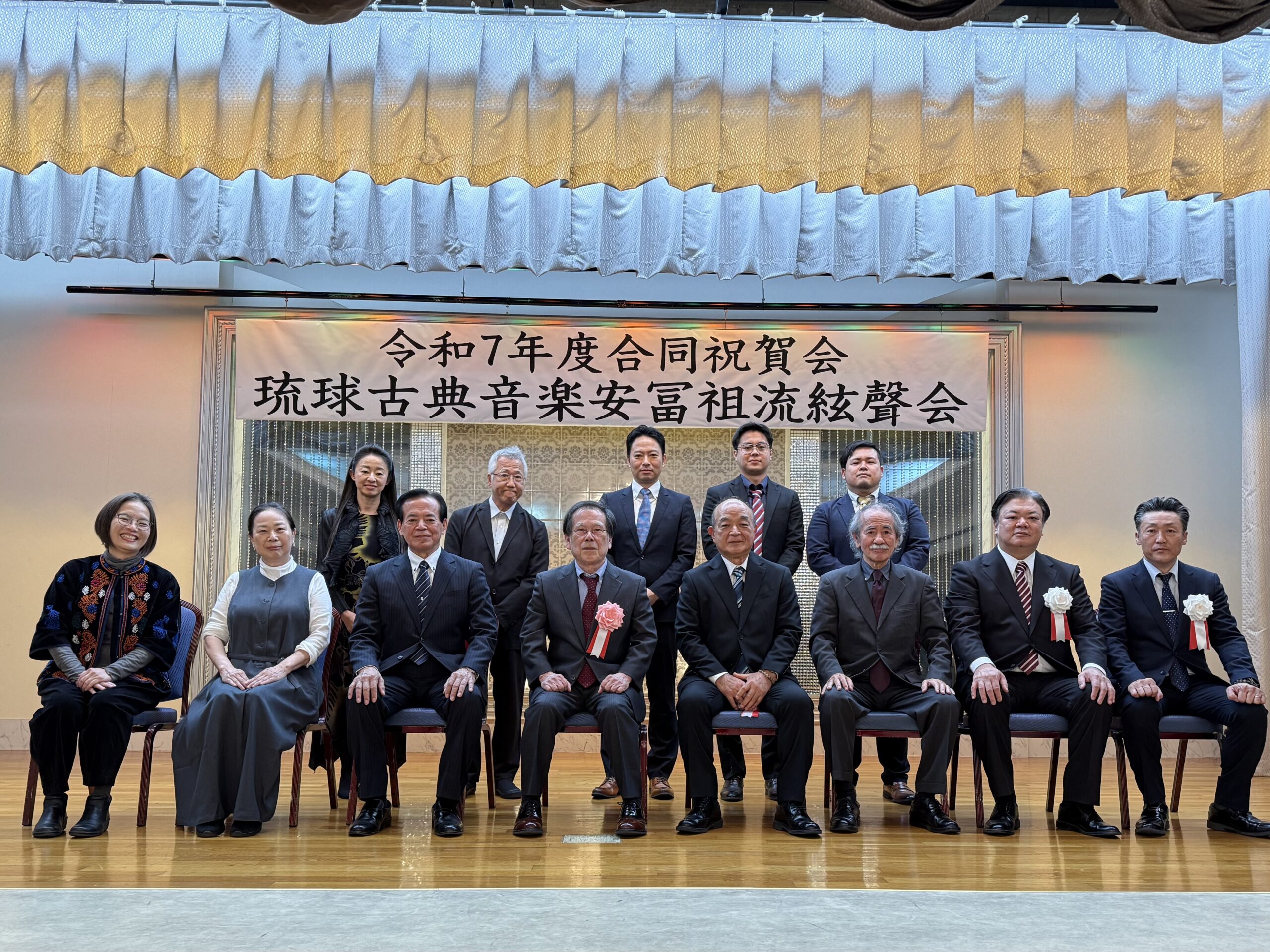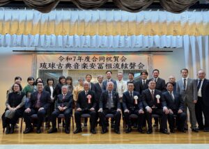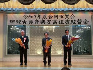 今回は、旭日小綬章を受章された大湾清之先生、沖縄県文化功労者に選ばれた照喜名進先生、そして琉球舞踊の保持者として総合認定を受けられた渡名喜康広先生を囲んでのお祝いの席となりました。